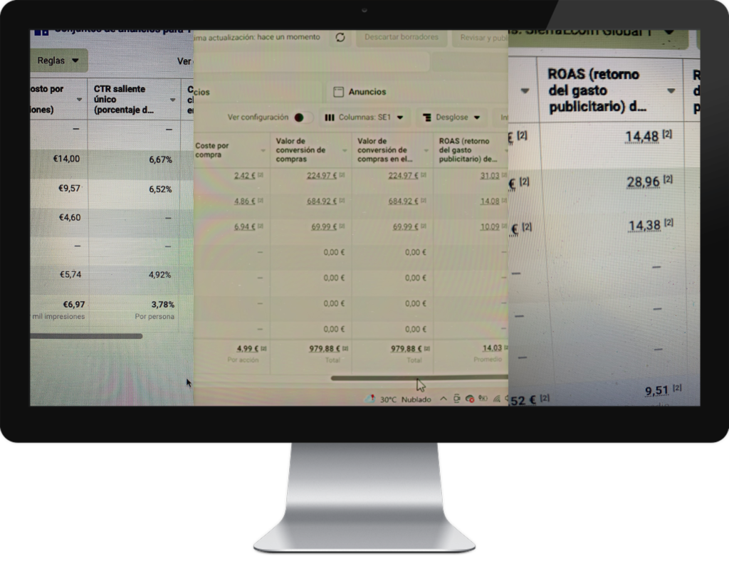 Por último, lo más importante. El resultado final del proyecto lo medimos con el ROAS (retorno de la inversión publicitaria). Es muy sencillo, por cada euro que se invierte se obtiene x. Si tenemos un ROAS de 30 quiere decir que por cada euro que invirtió el cliente ha generado 30 euros.